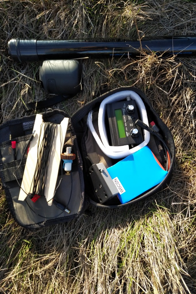 The 20 meter EFHW with the Sparkplug Gear 64:1 un-un was deployed in a sloping configuration favoring stations to the east, which is where I expected most my hunters to be located.