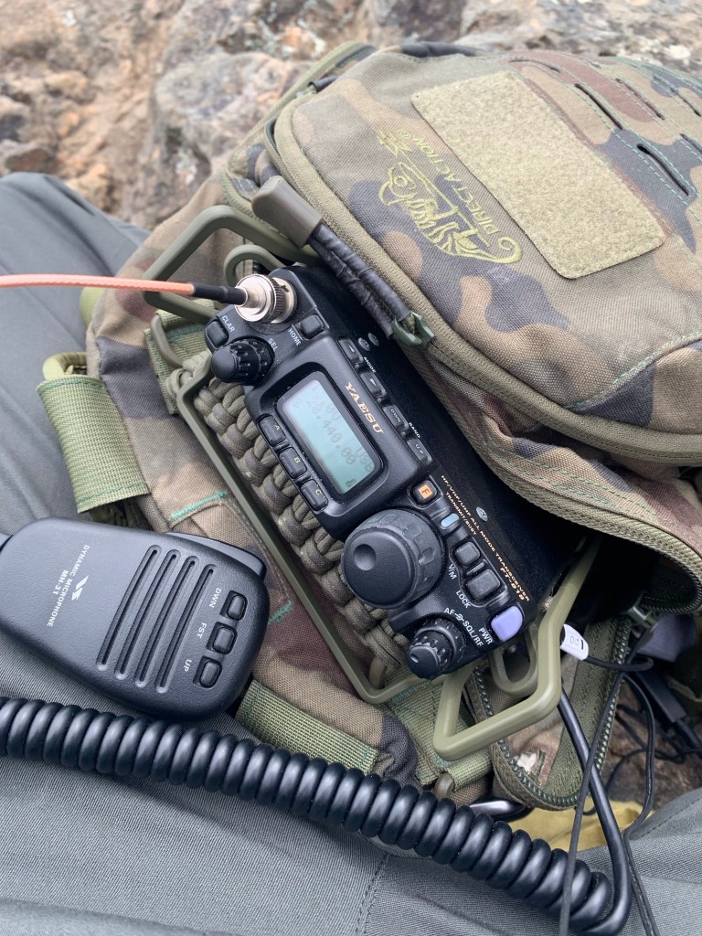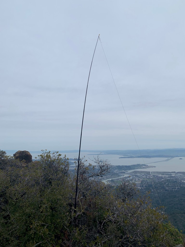I forgot to bring my phone, so I used my companion’s phone to sign into pota.app and spot myself on a clear frequency . The trouble with the summit of Tam is there is no real good place to sit. It’s all very rocky and uneven, so I did the best I could to find a comfortable position from which I could operate the radio and write in the logbook.