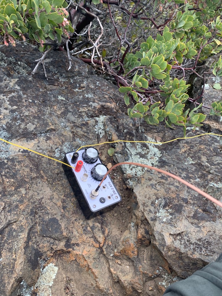 One 17 foot section of wire went up the partially extended Spiderbeam mast which I had stashed in a bush on the summit. The other section was tossed downhill over the mountainside as a counterpoise. The ZM-2 tuner served as the connection point for the two antenna elements and getting a good match was no problem.