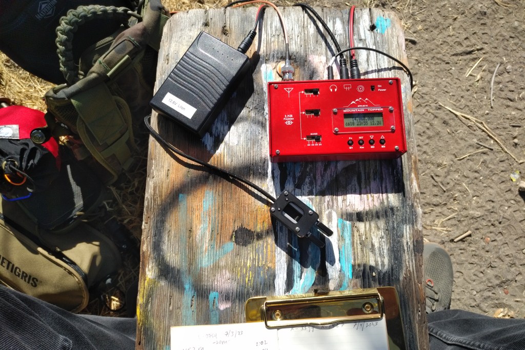I set up a 20M EFHW using the fiberglass mast tied to some downed tree branches and ran the feedline to the Mountaintopper, which showed a 1 to 1 match with the Sparkplug Gear 64:1 transformer.