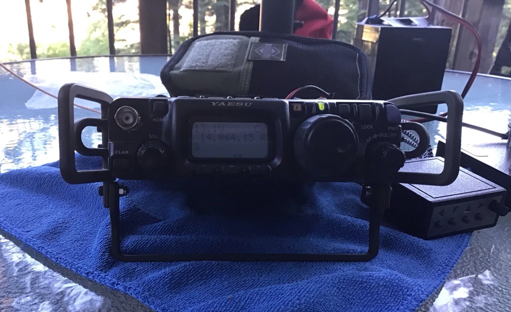 For the “base” operation of hunting other stations, I set up the FT-818 with an EFHW strung between the deck and some trees adjacent the nearby lake. The 26 ga polystealth wire antenna literally disappeared into the trees, the only giveaways being the 64:1 transformer floating in space off the deck rail and, more likely, the the bright orange arborist line used for the downhaul at the far end.