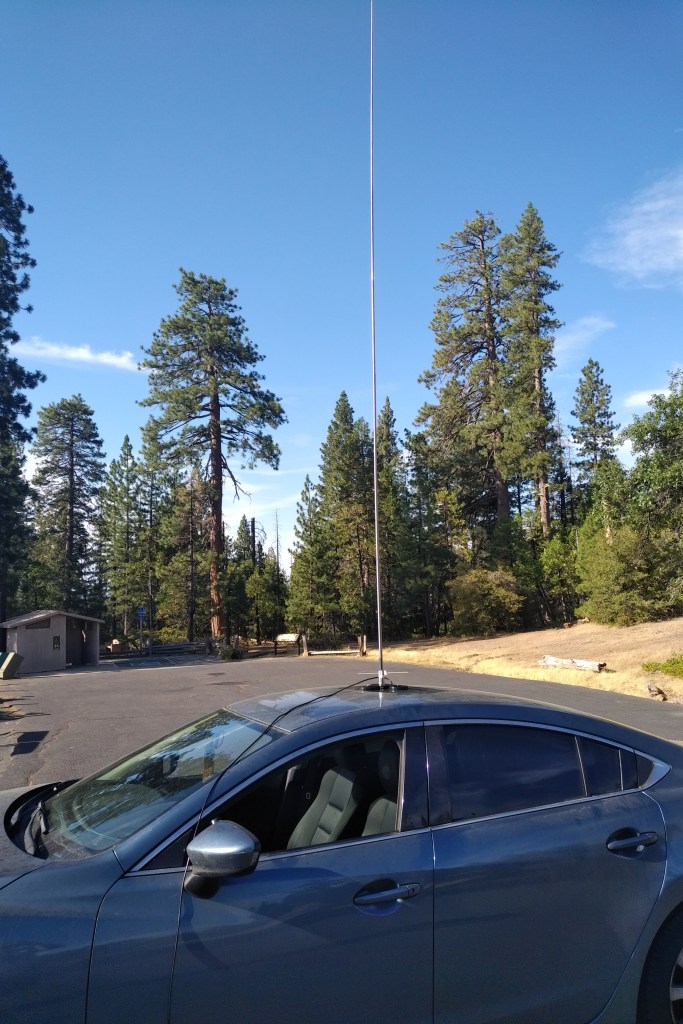 At first I set up my newly acquired MFJ-1979 17ft telescoping antenna as a 20M 1/4 wave vertical using a magmount atop the car, but the best SWR I could get was over 2 to 1! I’d tried this antenna once before from my home park and got a perfect 1 to 1 match with the Mountaintopper so I knew it could work.
