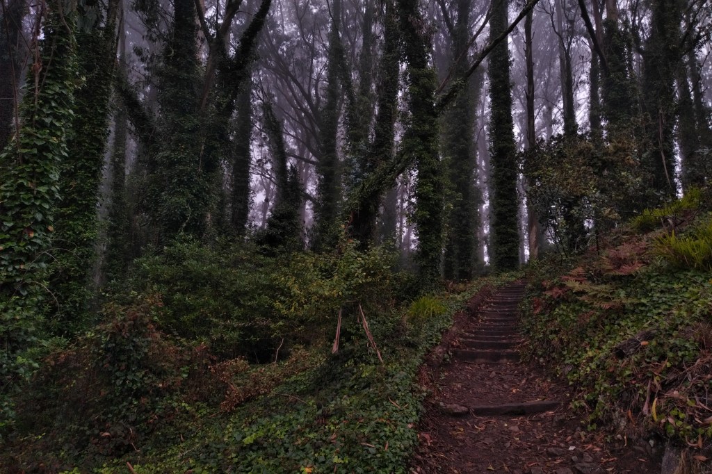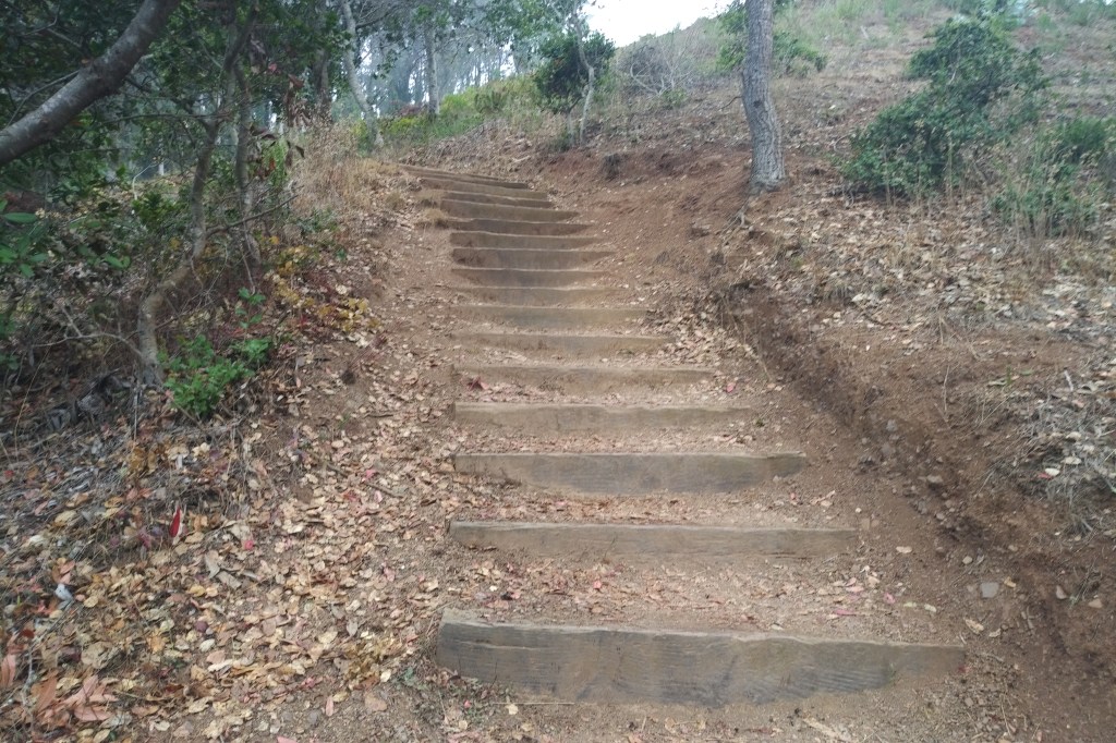 As the trail nears the intersection with the Alta trail, you enter a rainforest zone where tall eucalyptus trees filter the dense coastal stratus and drop the water as rain. The trail and road get very slick and muddy here.
