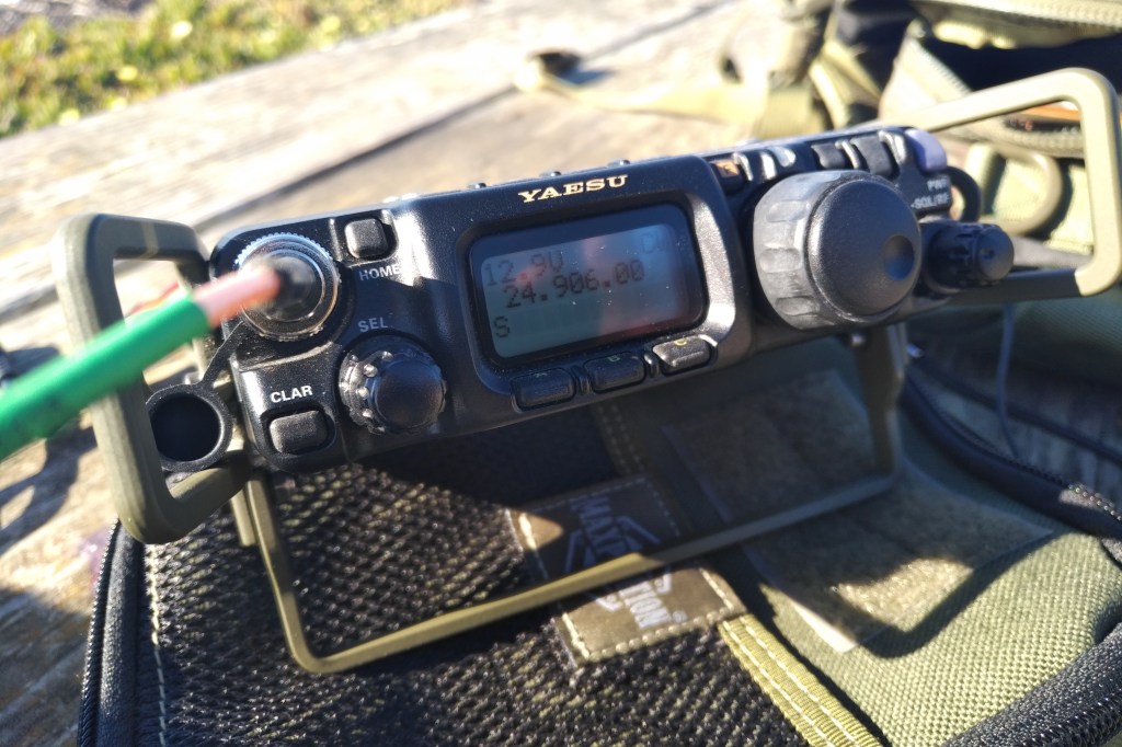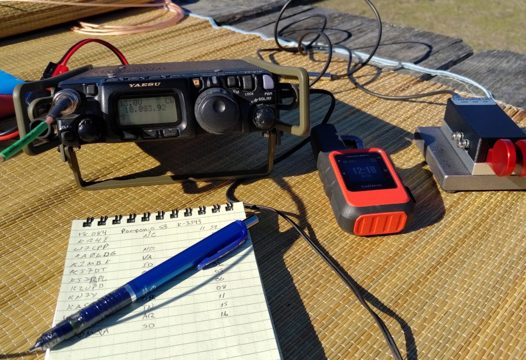 The 17 foot telescoping whip antenna was clamped to a barbecue grill and extended fully. I meant to start on 20 meters, but for whatever reason I couldn’t get a low SWR with today’s setup. I didn’t bring a tuner and adjusting the radials wasn’t helping, so I shortened the whip by a couple of segments and got a good match on 18 MHz.